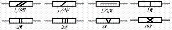 额定功率:在规定的环境温度和湿度下,假定周围空气不流通,在长期连续负载而不损坏或基本不改变性能的情况下,电阻器上允许消耗的最大功率。为保证安全使用,一般选其额定功率比它在电路中消耗的功率高1-2倍。额定功率分19个等级,常用的有0.05W、0.125W、0.25 W、0.5 W、1 W、2 W、3 W、5 W、7 W、10 W,在电路图中非线绕电阻器额定功率的符号表示如下图: